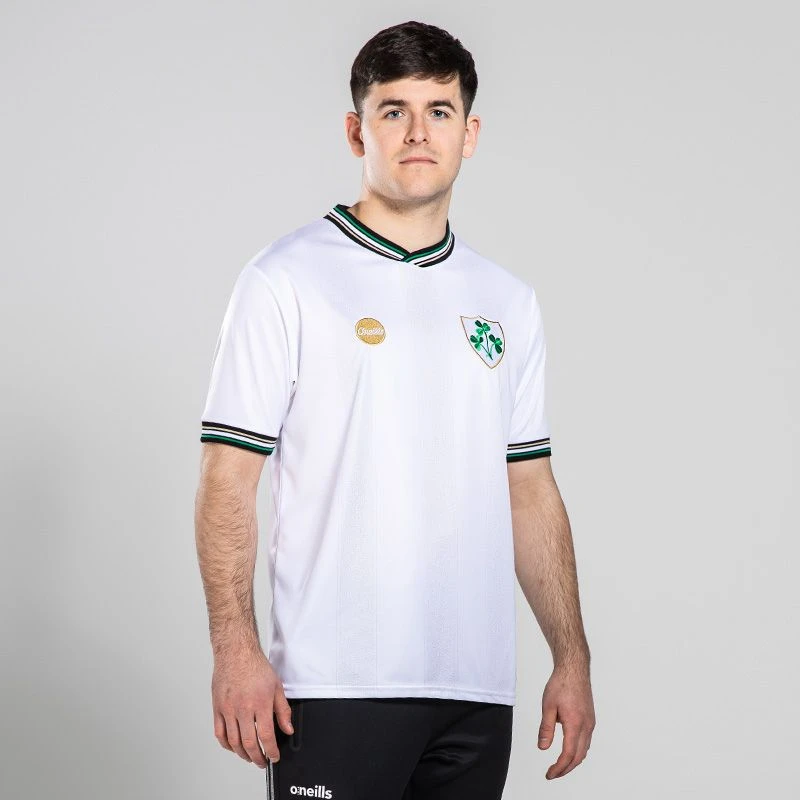 The Ireland Premier Jersey reinstates the traditional shamrock crest used on the kits of the Ireland soccer and rugby teams over the years. Encased in a shield with a rich gold thread, the shamrock crest recalls nostalgic memories of some of the greatest sporting icons and moments in Irish history. The classic O’Neills logo which was displayed on kits throughout the 70’s and 80’s sits proudly on the right chest with the new O’Neills logo on the upper back to create a timeless jersey.